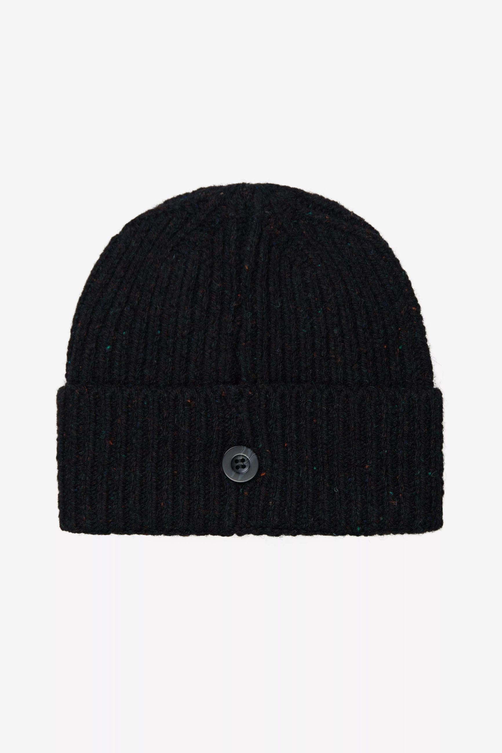 L’Anglistic Beanie è realizzato in morbido misto lana di agnello, cotone e acrilico caratterizzato da impuntura elasticizzata a coste, e presenta un aspetto vagamente puntinato. Il risvolto è impreziosito da un’etichetta quadrata in tessuto sulla parte anteriore e da un bottone fisso in corno sintetico sulla parte posteriore.
